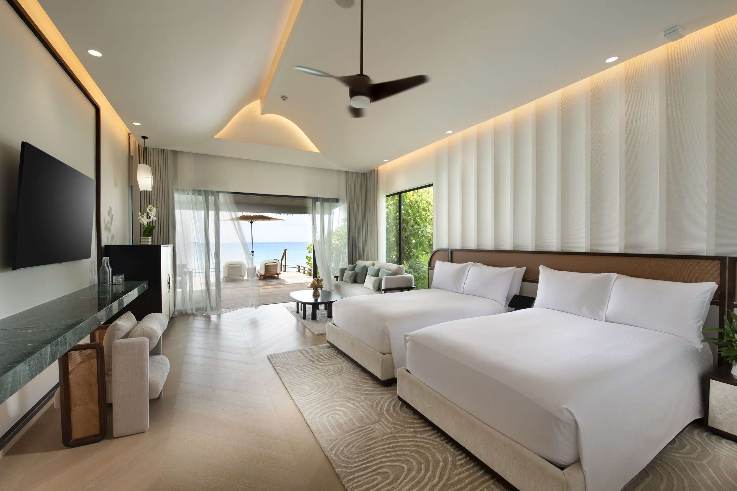The authentic nature of the resort is reflected in its warm, earthy and intimate settings inspired through a mix of light and tanned tones to create a harmonious blend of privacy and natural beauty. Harmonised fusion of indulgent luxury and contemporary design is found in every villa design, each with expansive terrace with lush landscaping and private pool enjoying uninterrupted ocean views. Guests can choose from a range of overwater and beachfront villas. The One-Bedroom Overwater Pool Villa provides an idyllic space for couples, complete with a hammock and sun loungers by the water. For families, the Two-Bedroom Beach Pool Villa offers ample space nestled in a beachfront setting with direct ocean access, versatile sleeping arrangements with a living room as well as two king-size beds or twin option in the second bedroom.