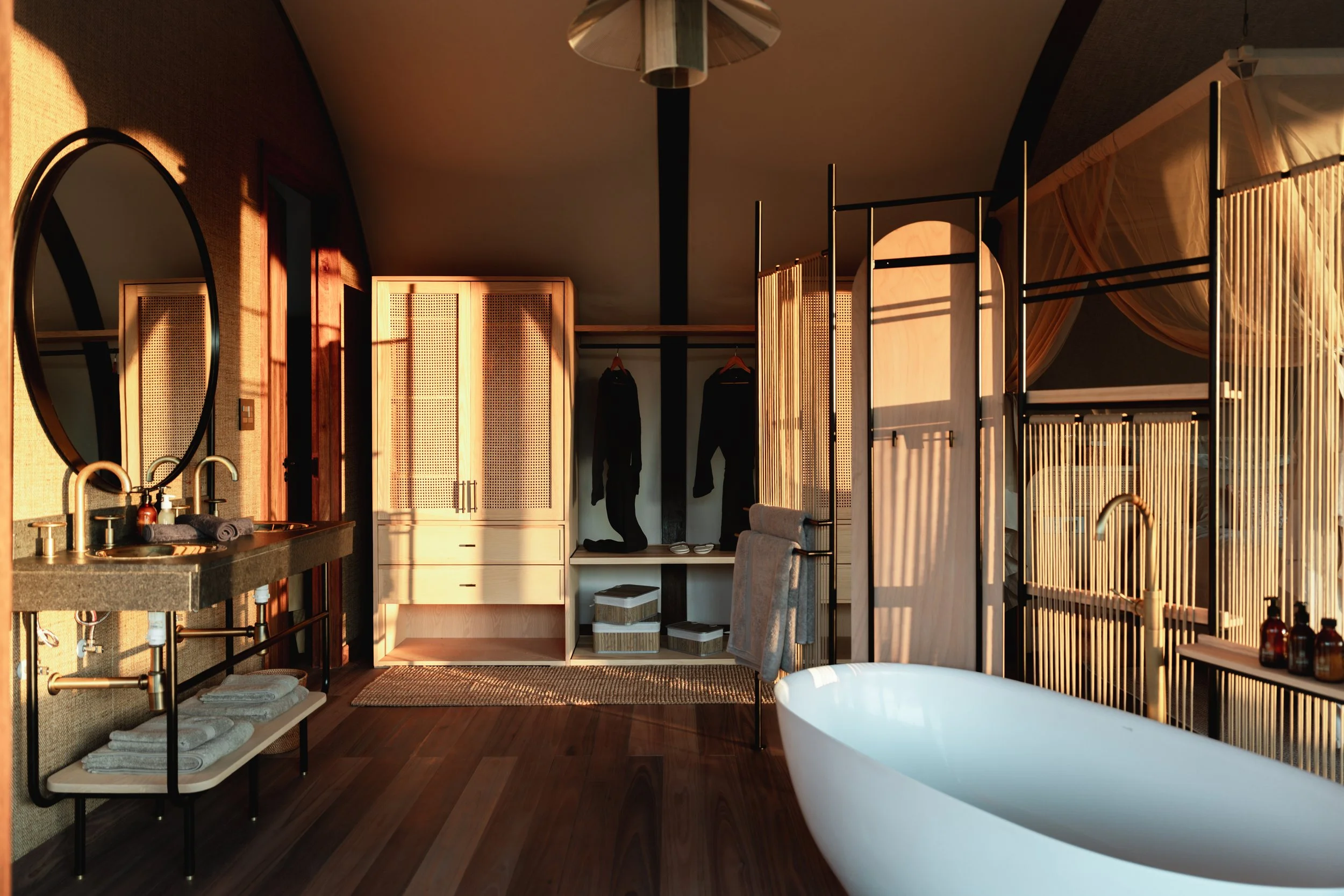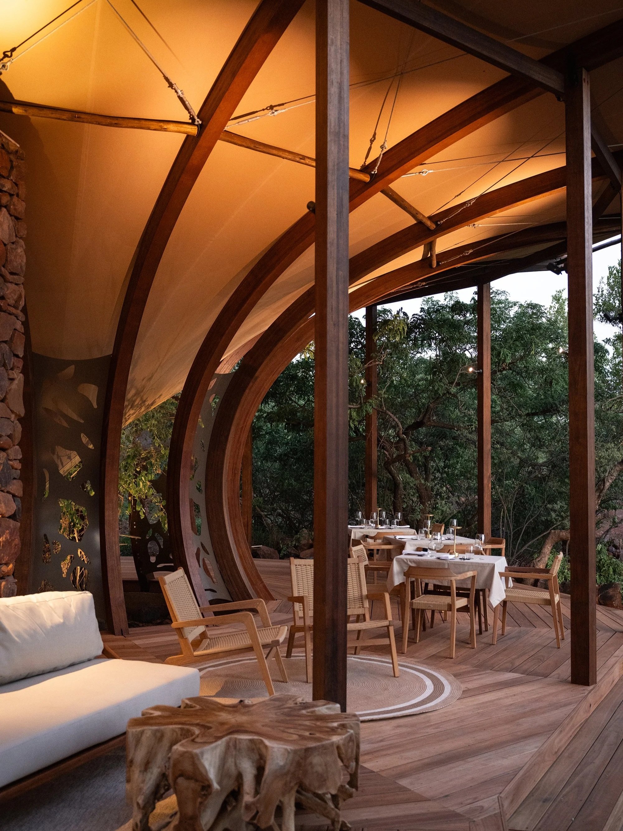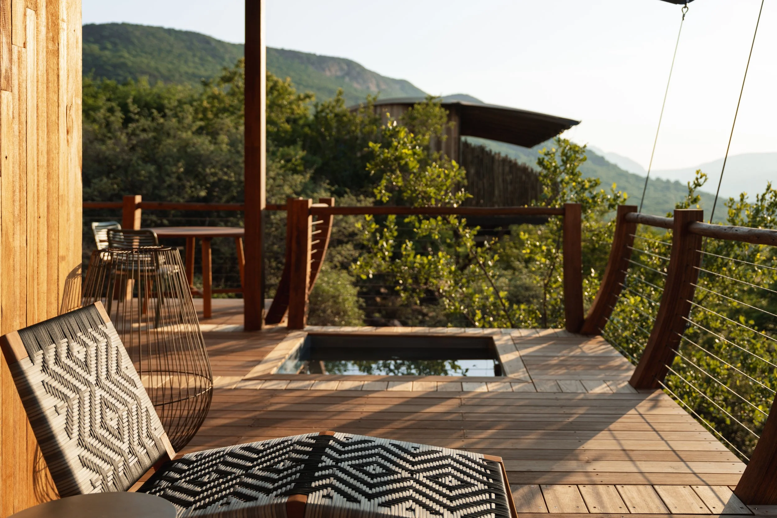 Carved into the very edge of the Western Soutpansberg, Few & Far’s cliff suites feel less like rooms and more like a gentle landing place between sky and valley. Locally sourced eucalyptus, shaped by resident craftsmen on the reserve, wraps the spaces in warm, honeyed tones; every beam, deck and detail tells of the land it came from. At dawn, guests drift from vast, cloud-soft beds to the cool embrace of a private plunge pool, steam curling into mountain air, then step beneath an outdoor shower where vistas stretch into horizons. Inside, thoughtful comforts of quiet air‑conditioning, an inclusive minibar, soft robes, with a wakening coffee sit easily alongside canvas, stone and timber of a tented paradise. Wide verandas float above the cliffs, inviting you to linger with binoculars in hand, trading stories of which child first spotted a giraffe moving through the valley below. Safety escorts at night, roller beds for younger explorers and in‑room radio service preserve the sense of adventure while keeping families at ease. Above all, the design honours regenerative principles, being built by local hands, from local materials, in a way that lets nature lead. Hospitality at Few & Far is not about excess, but about the profound luxury of feeling woven into the mountains themselves, to be cradled, restored and quietly rewilded.