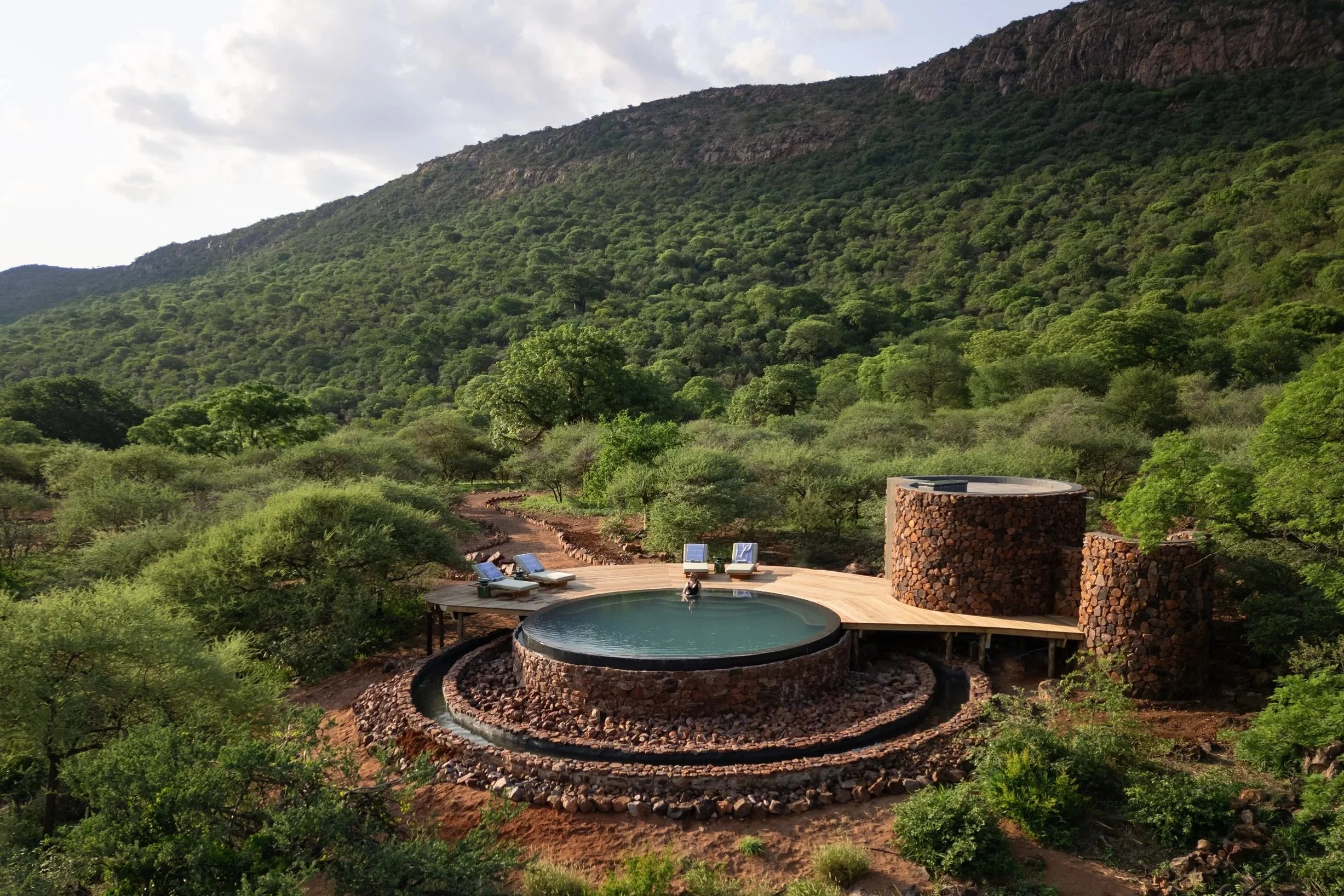 In the ancient hills the Venda call Luvhondo, Few & Far offers a new concept in safari adventure that feels like a long, deep breath where the mountain is the star of the show. Mornings might mean watching antelope melt into golden grass, following rhino or leopard tracks on foot with your private dedicated guide, game drives, waterfall swims or gliding by bike beneath wide Soutpansberg skies. As daylight softens, telescopes and sleep‑out decks turn the night into a theatre of stars. Between encounters, guests can drift toward the baobab‑inspired spa, where seed and pod elixirs shape massages, facials and bathing rituals that seem drawn from the trees themselves. Labyrinth walks, cultural encounters and “conservationist for a day” experiences root you in the land’s stories, while the large kitchen garden provides diverse culinary adventures from bush breakfasts to picnics and taster menus with each adventure ending in quiet, nourishing comfort. Dedicated activities crafted for kids allow them to learn about tracking, snake handling, creating leopard footprints from plaster of Paris and fire making.